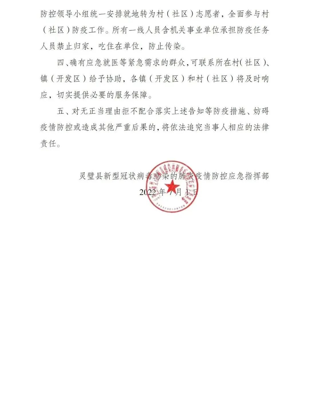 鉴于当前周边地区严峻复杂的疫情防控形势,且灵璧县已有关联病例,为快速阻断疫情传播,切实维护全县人民群众生命安全和身体健康,尽快实现疫情动态清零目标,经灵璧县疫情防控应急指挥部研究决定,自2022年7月1日16时起,在灵璧全县范围内实施足不出户管控措施。
