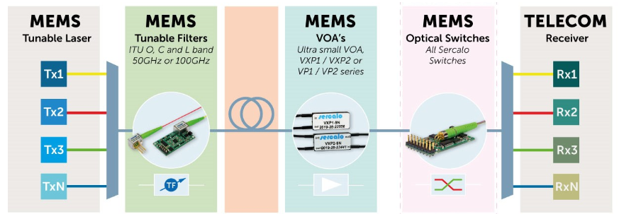 图 1:MEMS 器件用于可调谐激光器、可调谐滤波器、可变光衰减器 (VOA)、光开关和其他先进的通信设备。(图片:Sercalo Microtechnology)