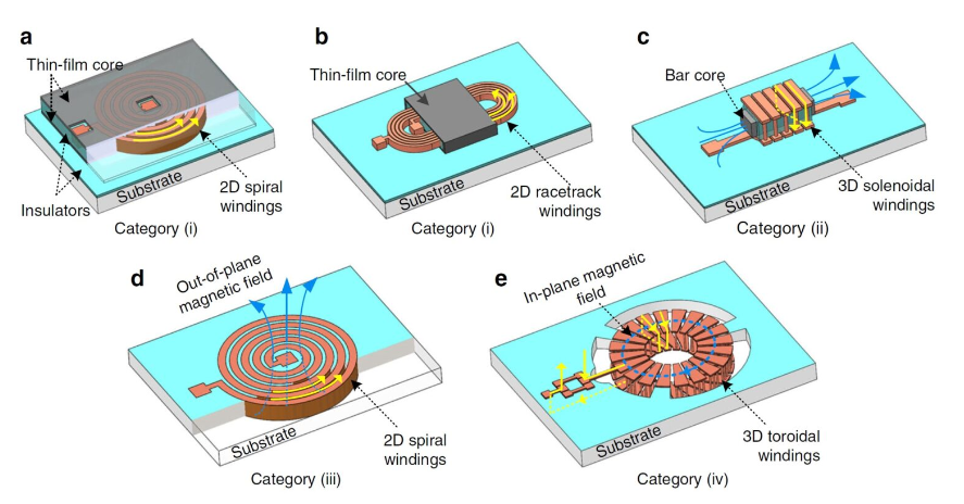 MEMS 电感器可以按多种方式分类,例如工作频率、功率处理和几何形状。一种常见的分类是基于绕组相对于基板的位置及其形状,(图 2):(i) 基板上的 2D 电感器,进一步细分为螺旋电感器 (a) 和跑道型电感器 (b);(ii) 具有磁棒芯 (c) 的 3D 基板上螺线管电感器;(iii) 2D 基板内螺旋电感器 (d),以及 (iv) 3D 基板内环形电感器 (e)。