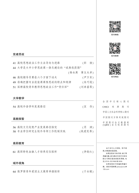12 “新文科”背景下的史学研究与人才培养(陈春声)17 推进管理学领域新文科建设的方向与举措(黄有方)20 深刻理解习近平总书记关于教育的重要论述核心思想和精髓要义(翟 博)29 构建“十四五”时期科技创新“新生态” (江 波)33 传承“红色基因” 建设世界一流大学(靳 诺)44 大学是大中小学思政课一体化建设的 “成熟收获期”(杨永庚 第五太卓)49 准确把握专业技能课课程思政的特点和规律 (朱巧莲)51 深耕高校青年教师思想政治工作“责任田”(刘幸菡等) 58 专业学位研究生校外导师工作机制实践(钱爱民等)