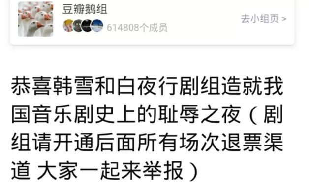 “音乐剧《白夜行》剧组女主全国十几个城市巡演无B卡,无替补。女主韩雪感冒后已经无法演唱却隐瞒观众直到当天7:30进场播放完演出须知才告知本场演出韩雪个人演唱部分为录音。严重欺诈。且违反我国演出法所规定的不得假唱的相关规定。扰乱我国演出市场。”