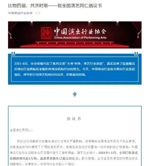 不久前,据中国演出行业协会《致全国演艺同仁倡议书》中指出:根据在会员范围内进行抽样调查的不完全统计,今年1至3月,全国已取消或延期的演出近2万场,直接票房损失已超过20亿元。这意味着,在承担固定成本开支的情况下,基本行业相关的公司都正在遭受着演出项目取消或者延误所带来的不同程度的损失。这对于线下演艺行业的是一次空前的承压,各方也都在寻找新思路以道缓解当前困境。