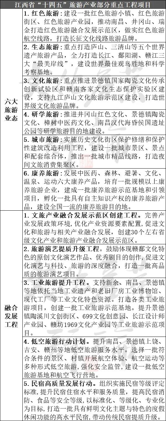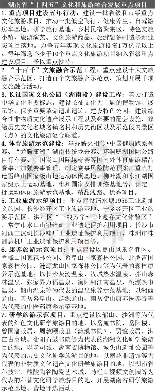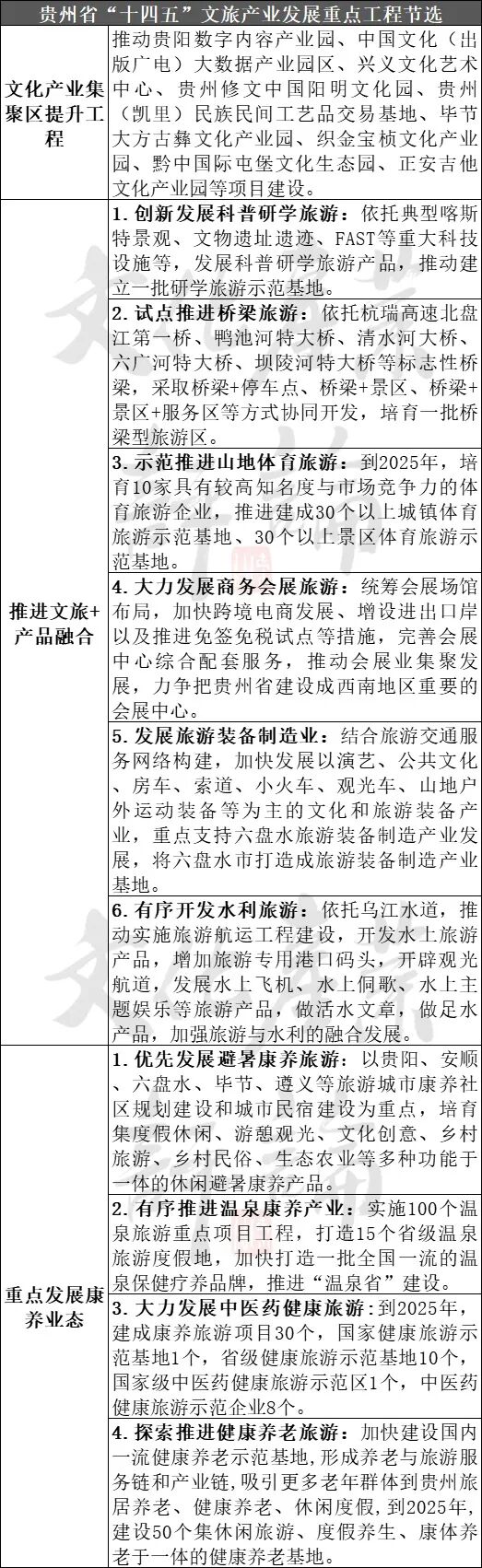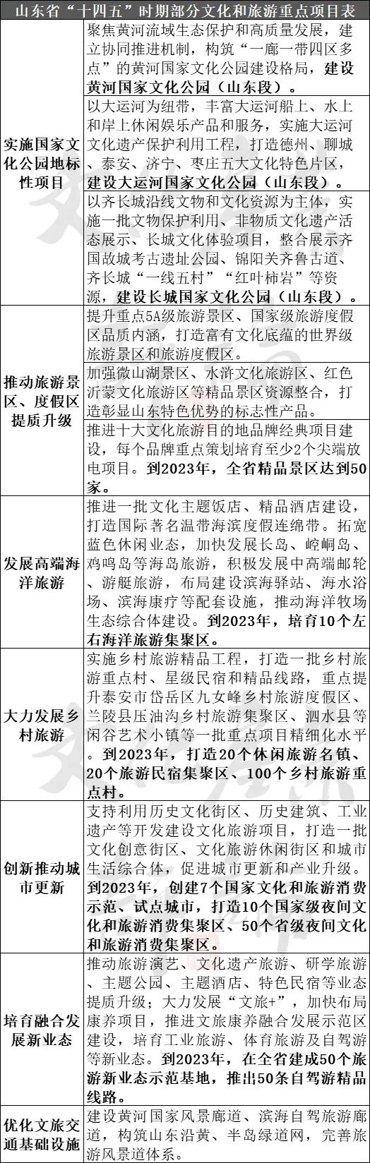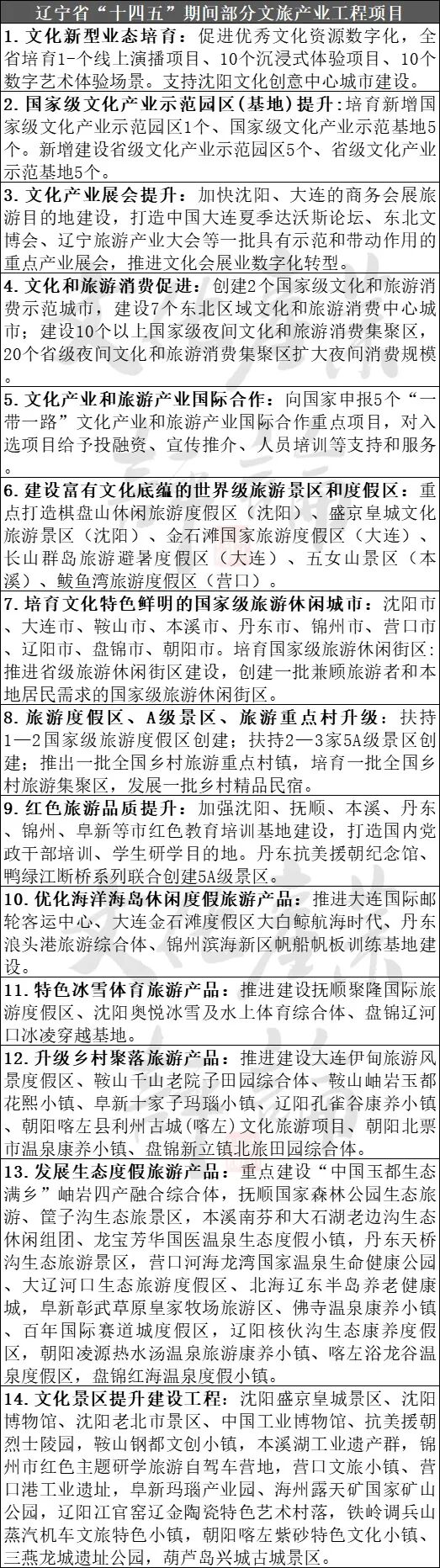 浙江省旅游业发展“十四五”规划提出,“十四五”时期聚焦高质量、竞争力、现代化,积极打造良渚文化等一批世界级文化标识;达到国家全域旅游示范省标准;努力建成全国文化高地、中国最佳旅游目的地、全国文化和旅游融合发展样板地,为建设“新时代全面展示中国特色社会主义制度优越性重要窗口”贡献标志性成果。在重大文旅项目建设方面,浙江省提出,推进“四条诗路”、10大海岛公园、十大名山公园等文旅重大项目建设,完成投资1万亿元,每年2000亿元。实施文化弘扬工程,建设浙江省大运河国家文化公园,打造良渚文化、上山文化、阳明文化、和合文化、南孔文化、宋韵文化等100个文化标识,建成之江文化中心等一批文化工程;实施新时代文艺精品创优工程,打造10个全国领先的知名旅游演艺品牌项目等。山东省文化旅游融合发展规划(2020—2025年)提出,发挥齐鲁文化优势,推动文化与旅游深度融合,大力发展精品旅游,建设红色文化旅游基地、优秀传统文化旅游基地,打造文化旅游融合发展新高地、国际著名文化旅游目的地。在文旅项目建设方面,实施大运河国家文化公园(山东)建设、齐长城国家文化公园建设、黄河文化保护传承弘扬、旅游景区质量提升、历史城区文化旅游整合打造等五大工程,并建立黄河文化旅游重点项目库,储备入库项目200余个,计划总投资超过5700亿元。两年来,共贴息支持沿黄地区15个重点文旅项目2962万元,带动沿黄重点项目完成投资近110亿元。广东省将建设高质量现代文化产业体系和现代旅游业体系,作为“十四五”时期文化和旅游发展的重中之重。在《规划》明确,到2025年,省级以上文化产业示范园区(基地)90个,省级以上文化产业和旅游产业融合发展示范区40个,4A级以上景区数量239个,省级以上旅游度假区数量40个。《规划》还发布了47个“十四五”广东省文化和旅游重大工程项目。其中,省直文化和旅游重大工程项目共7项,包括广东美术馆、广东粤剧文化中心、广东人民艺术中心、广东省水下文化遗产保护中心、长征国家文化公园(广东段)、鸦片战争海防遗址公园等;市级文化和旅游重大工程项目共40项,包括广州长隆粤文化项目、广州天人山水“玉英谷”旅游首期项目等。福建省“十四五”文化和旅游改革发展专项规划提出,到2025年,文化强省建设和全域生态旅游省建设取得重大成果,文化和旅游领域高质量发展超越迈出重要步伐,文化产业和旅游产业在全国的位次明显提升,福建作为我国重要的自然和文化旅游中心、21世纪海上丝绸之路旅游核心区、世界知名旅游目的地的地位更加凸显。《规划》明确,未来几年,福建将以79个“十四五”文化和旅游重点项目为支撑,推进“十四五”文化和旅游改革发展。并提出,对重大旅游标志性产品和项目给予每个30万元前期规划设计费补贴;对新引进的境内外企业在闽投资文化旅游景区,落地开工且首年实际完成工程投资额超过2亿元(不含土地及征迁费用),给予每个300万元奖励。海南省“十四五”旅游文化广电体育发展规划提出,海南将在“十四五”期间推进环岛旅游公路、生态旅游工程、全省免税购物系统工程等15项省级标志性工程的建设,打造7个省级文化旅游产业园区和40个重点旅游度假区。到2025年旅游总人数实现11000万人次、旅游总收入达到1800亿元、入境游客达到260万人次。湖南省“十四五”文化和旅游发展规划明提出,通过构建五大文化和旅游融合发展板块、五大省际文化旅游联动区、四大文化旅游走廊“554”全省文旅发展新格局。力争至2025年,旅游业年总收入由2020年的8261.95亿元增长至1.3万亿元左右,旅游业增加值占GDP比重由2020年的6.18%提升至6.5%左右。力争5年实现文化旅游投资1万亿元以上。12.江西省:20个主题工程全力争创国家文旅产业重要基地江西省“十四五”文化和旅游发展规划提出,到2025年,赣鄱文化软实力进一步提升,社会文明程度得到新提高,人民群众精神生活日益丰富,文化赋能和旅游为民、旅游带动作用全面加强,文化事业、文化产业和旅游业成为经济社会发展的强大动力和重要支撑,成为国家文化和旅游产业重要基地。并提出了11项主要任务和20个主题工程。13.陕西省:计划投入8500亿元新建重点文旅项目524个陕西省“十四五”文化和旅游发展规划提出,积极构建“一核四廊三区”文化和旅游发展新格局,推进文旅与相关产业实现深度融合,不断激发新动能、创造新繁荣,“十四五”时期计划投入8500亿元新建重点项目524个。深入开展文化产业“十百千”培育工程,全省现有国家级文化产业示范园区1个、基地11个,国家动漫认定企业10家,相关联企业营收达25.88亿元。14.贵州省:梳理总投资500万元以上重点项目995个贵州省“十四五”文化和旅游发展规划提出,到2025年,全省旅游及相关产业增加值在2019年的基础上翻一番,达到1860亿元以上,接待入黔游客年均增长10%以上,旅游人均花费水平进入全国第一方阵。在项目储备方面,全省各地积极谋划一批优质景区景点、文商旅综合体、农文旅综合体、温泉养生、避暑度假、旅游装备制造、乡村旅游等重点文化旅游项目995个。其中,国有项目537个,民营项目403个,混合制项目32个。截至10月底,995个旅游产业重点项目累计完成投资887.90亿元,完成全年目标任务的88.79%;累计签约文旅项目778个,签约总金额2632.9049亿
