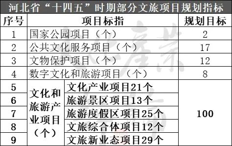 规划明确,“十四五”期间,河北省文化和旅游重点项目共有139个,其中,国家文化公园项目2个、公共文化服务项目17个、文物保护项目12个、数字文化和旅游项目8个、文化和旅游产业项目100个(包括文化产业项目21个、旅游景区项目13个、旅游度假区项目25个、文化和旅游综合体项目12个、文化和旅游新业态项目29个)。