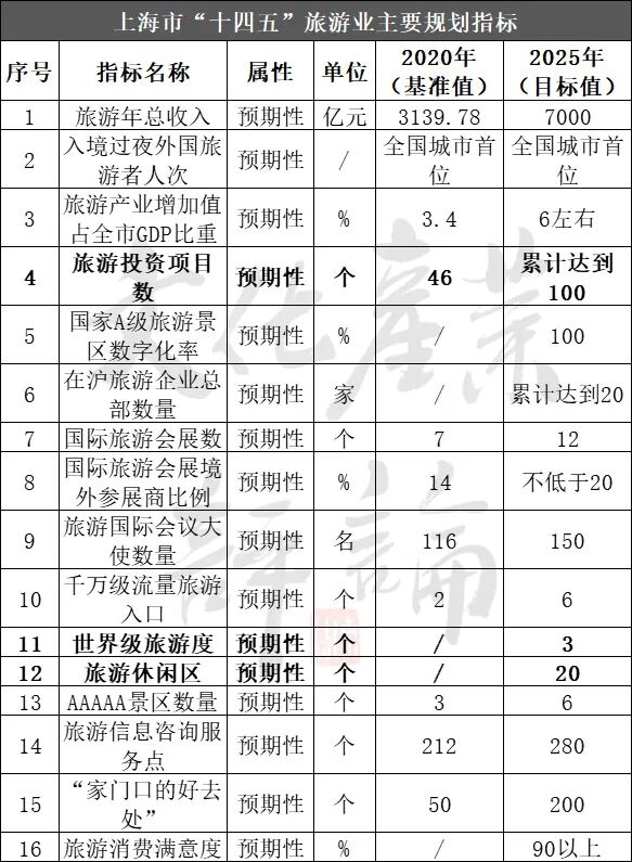 上海市“十四五”时期深化世界著名旅游城市建设规划提出,至2025年,上海将力争实现旅游年总收入达到7000亿元,旅游产业增加值占上海GDP比重达到6%左右,建设成为都市旅游首选城市、国际旅游开放枢纽、亚太旅游投资门户、国际数字旅游之都。并在规划指标中明确,到2025年旅游投资项目数在2020年46个的基准值上累计达到100个。9月下旬,在上海首届旅游投促大会上,两个“1000亿”上海“十四五”54个重大旅游投资项目和招商项目正式启动。其中,“十四五”重大旅游投资启动项目共30个、总投资1132亿元,涵盖金山滨海国际文化旅游度假区、上海国际旅游度假区、上海乐高乐园度假区等相关项目;旅游招商项目共24个、预计投资额1150亿元,项目涵盖主题乐园配套设施、生态郊野公园、文体商业综合体等。△上海“十四五”54个重大旅游投资项目和招商项目启动仪式江苏省“十四五”文化和旅游发展规划明确,至2025年江苏建成文化建设高地、旅游高质量发展示范省、文化和旅游深度融合发展样板区,推动江苏成为水韵人文魅力充分彰显的世界著名旅游目的地;设置文化和旅游产业累计投资额超万亿、省级及以上全域旅游示范区数量新增15个左右等18个指标和规划目标。与此同时,规划还遴选出省直、市直重大项目90个,形成《“十四五”时期江苏文化和旅游重点项目表》,其中,文旅设施类项目20个,文化遗产保护利用类项目25个,文化和旅游产业类项目45个。江苏省“十四五”文化和旅游发展主要指标显示,十四五时期江苏省文化和旅游产业累计投资额将超万亿。规模总量已经超过北京和上海。![]()