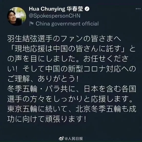 甚至本次冬奥开幕前,有日本的羽生结弦粉丝在网络上拜托中国观众为他加油。为此,外交部发言人华春莹还特别做出了回应:“羽生结弦的粉丝们,我看到有日本民众拜托中国观众为他加油,请交给我们吧!”
