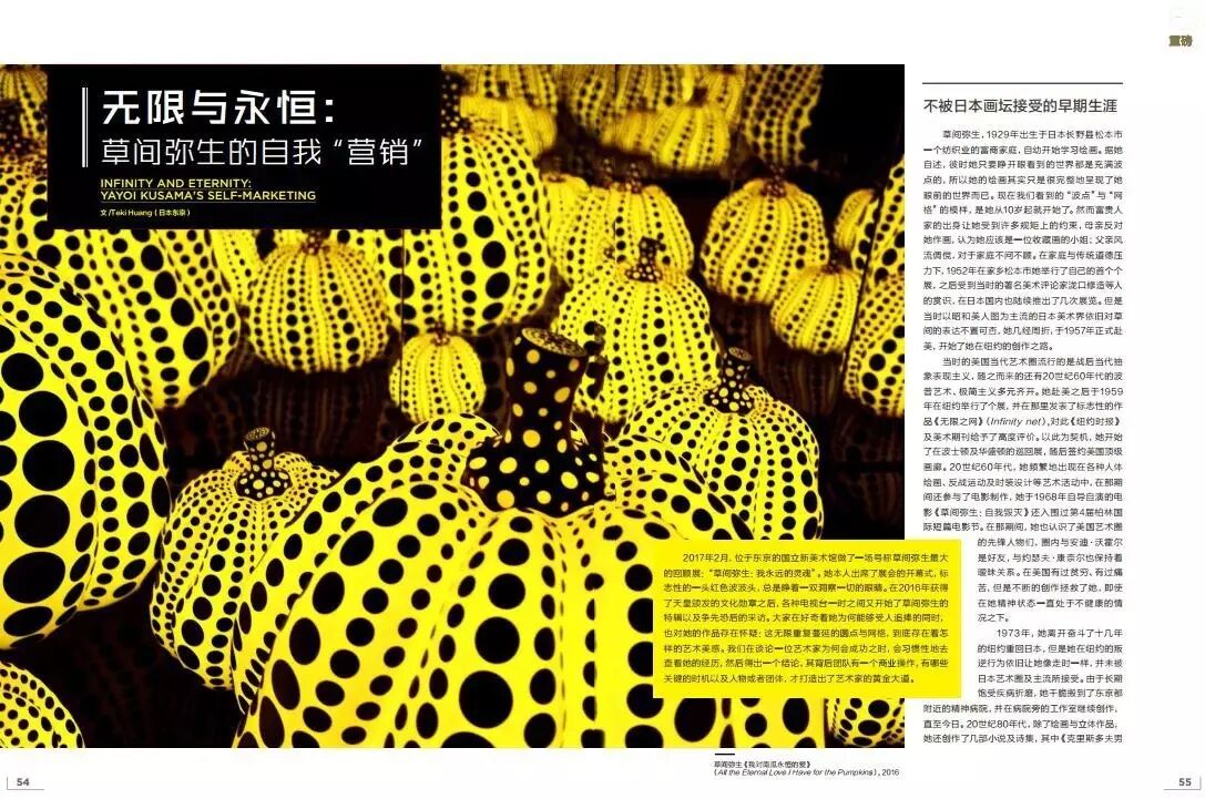 2017年2月,位于东京的国立新美术馆做了一场号称草间弥生最大的回顾展:“草间弥生:我永远的灵魂”。她本人出席了展会的开幕式,标志性的一头红色波波头,总是睁着一双洞察一切的眼睛。在2016年获得了天皇颁发的文化勋章之后,各种电视台一时之间又开始了草间弥生的特辑以及争先恐后的采访。大家在好奇着她为何能够受人追捧的同时,也对她的作品存在怀疑:这无限重复蔓延的圆点与网格,到底存在着怎样的艺术美感。我们在谈论一位艺术家为何会成功之时,会习惯性地去查看她的经历,然后得出一个结论,其背后团队有一个商业操作,有哪些关键的时机以及人物或者团体,才打造出了艺术家的黄金大道。