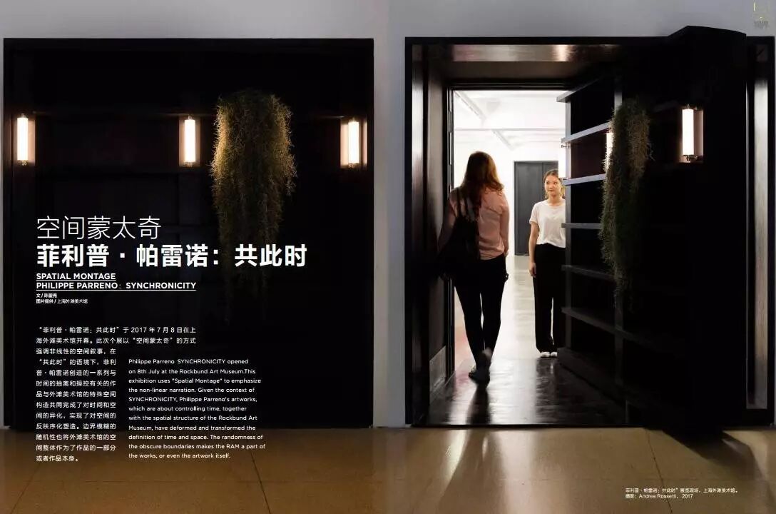 “菲利普·帕雷诺:共此时”于2017年7月8日在上海外滩美术馆开幕。此次个展以“空间蒙太奇”的方式强调非线性的空间叙事,在“共此时”的语境下,菲利普·帕雷诺创造的一系列与时间的抽离和操控有关的作品与外滩美术馆的特殊空间构造共同完成了对时间和空间的异化,实现了对空间的反秩序化塑造。边界模糊的随机性也将外滩美术馆的空间整体作为了作品的一部分或者作品本身。