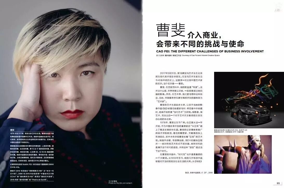 2017年5月31日,第18辆宝马艺术车在北京民生现代美术馆全球首发。在宝马艺术车诞生迄今40余年的历史上,这是第一次出现中国艺术家的名字。这个名字是—曹斐。