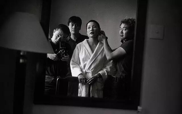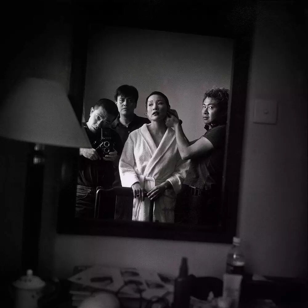 李威廉为陈冲上妆,孙周和张海儿在一旁观看,上海龙华宾馆,1999年