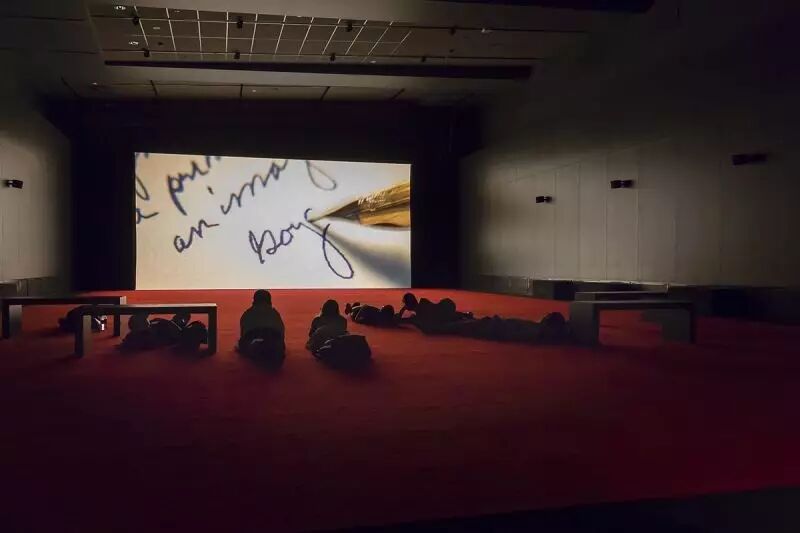 一个与建筑自身中轴对齐的竖立「平面」将贯通全部四层空间,这个「平面」在一楼是一座旋转的书架机关,在二楼是一个大型移动屏幕,上面播放着 Parreno 2002年的电影作品《这世界以外的任何地方》(Anywhere Out of the World)的一个全新版本。