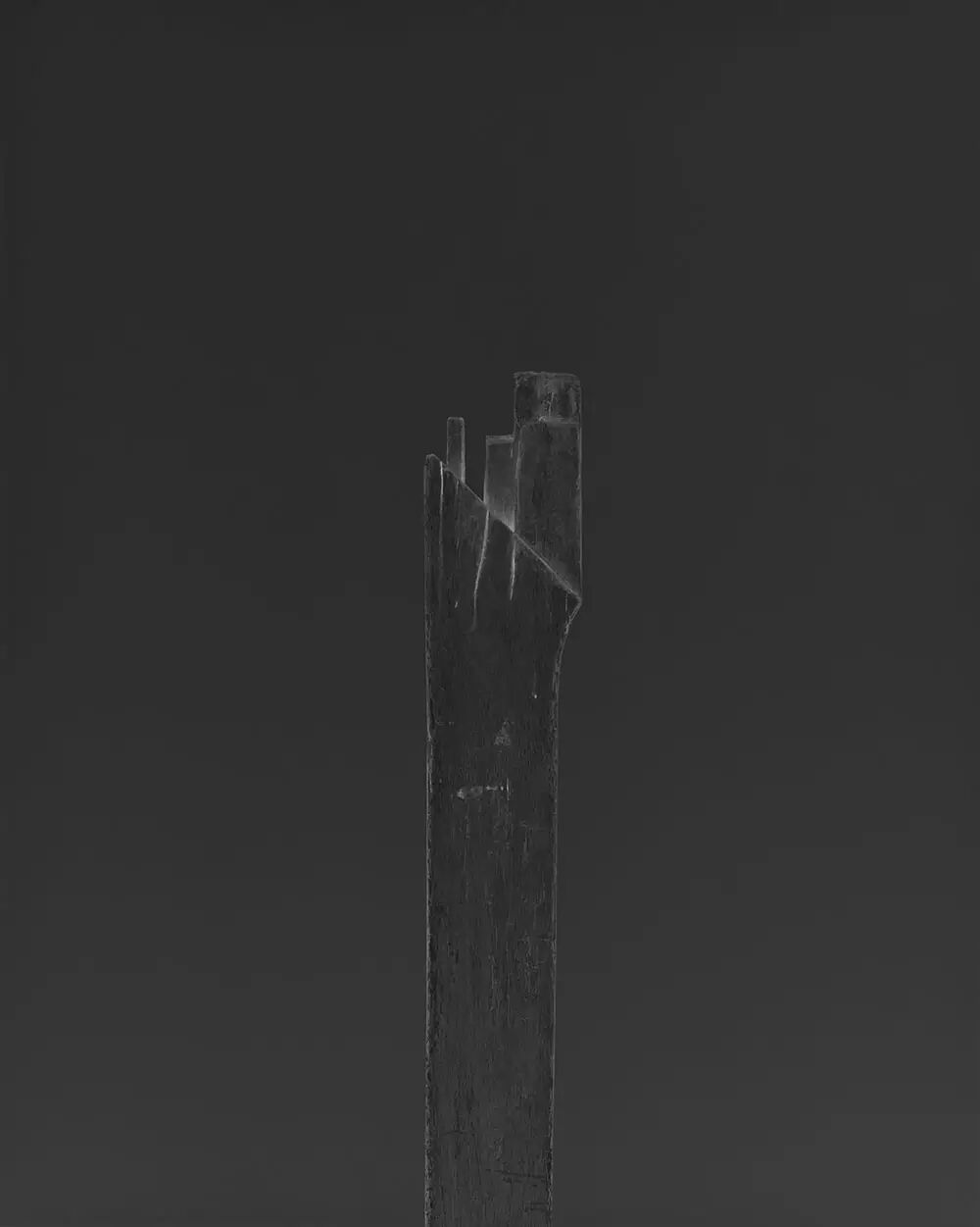此次展览中,秦一峰用大画幅座机拍摄被损坏的明制木器部件,他的负片作品消除了文献性——物件的构造及其在漫长时间中的经历,以及摄影性——还原物件现状的逼真空间。他通过压缩画面的深度,使负片平布的质量趋于紧致,以适当的灰度营造出安静的视觉体验。