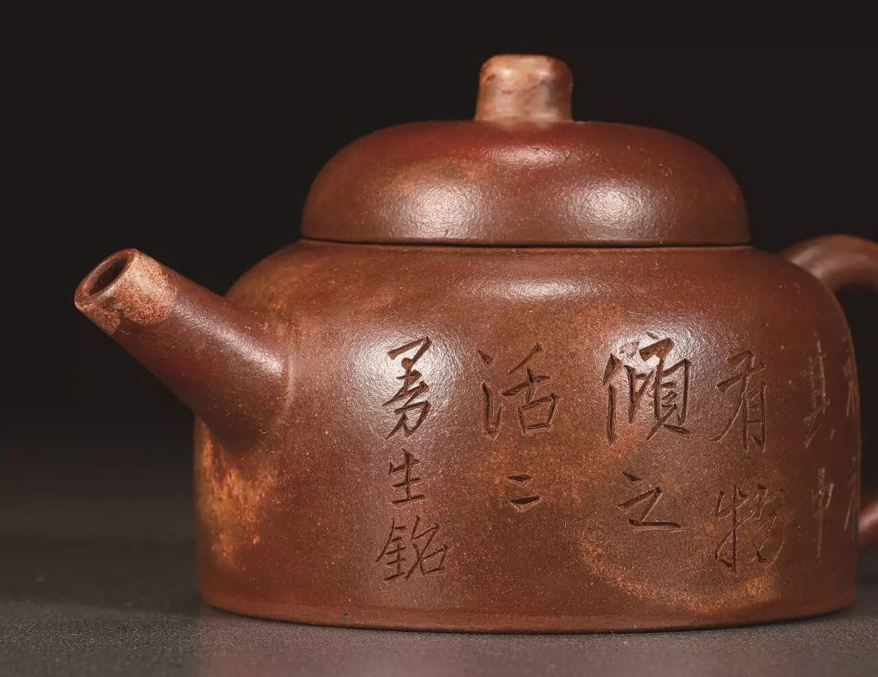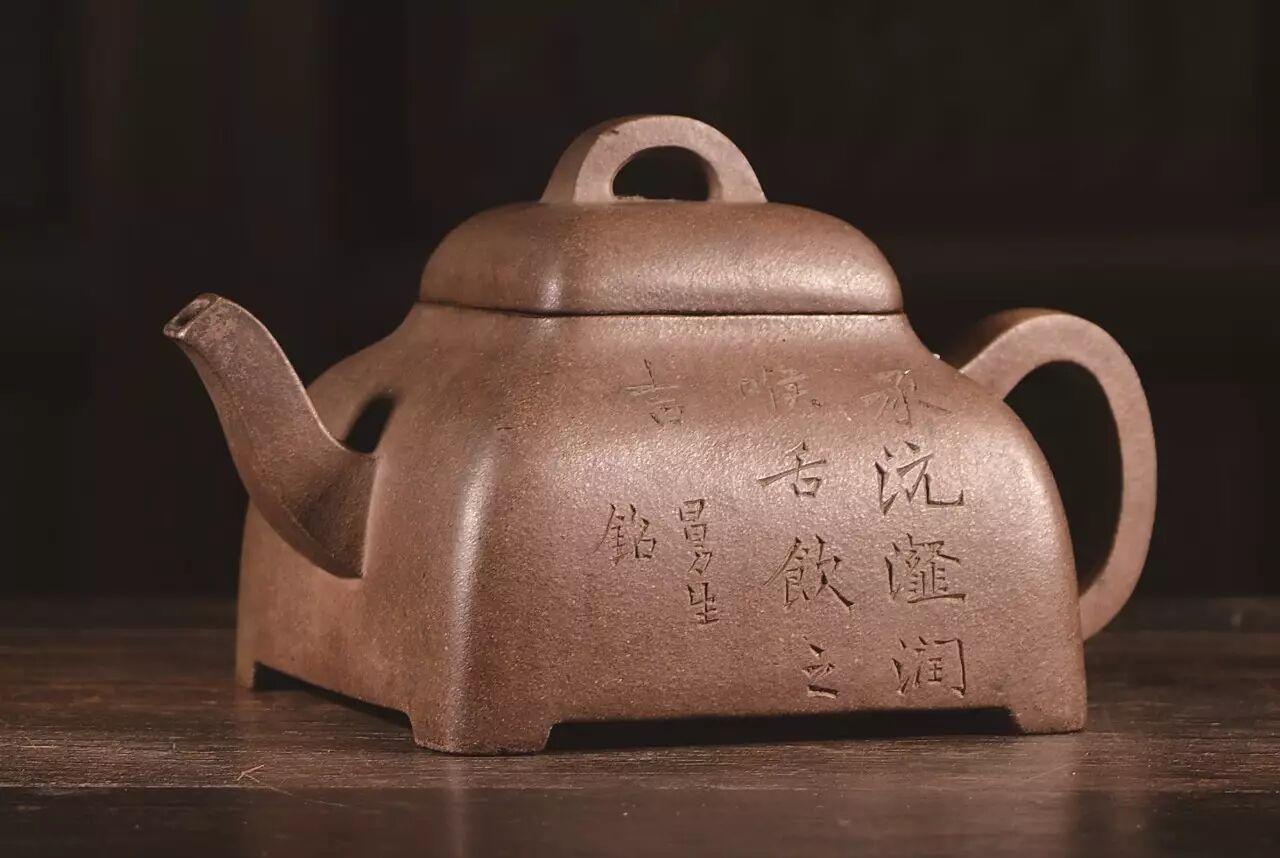 陈曼生开创了紫砂壶“切定茗壶并贴切壶形”的先河,其铭文更典雅,语言优美,耐人寻味。在存世的曼生壶上,大多镌刻着与壶匹配的文字,以简朴造型取胜的紫砂壶,辅以简短文句,文与壶相得益彰。例如,藏于上海博物馆的提梁紫砂壶上书“煮白石,泛绿云,一瓢细酌邀桐君”。