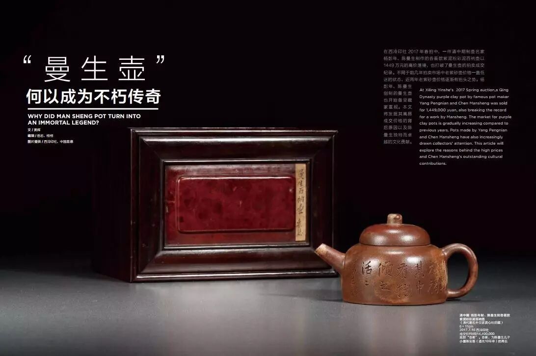 2017年7月16日,在西泠印社春拍“中国历代紫砂器物暨茶文化”专场中,估价650万~800万元的清中期龚心钊旧藏,杨彭年制、陈曼生刻香蘅款紫泥粉彩泥百衲壶在多轮竞价后,最终以1449万元成交。这一成交价也创了曼生壶作品拍卖纪录。