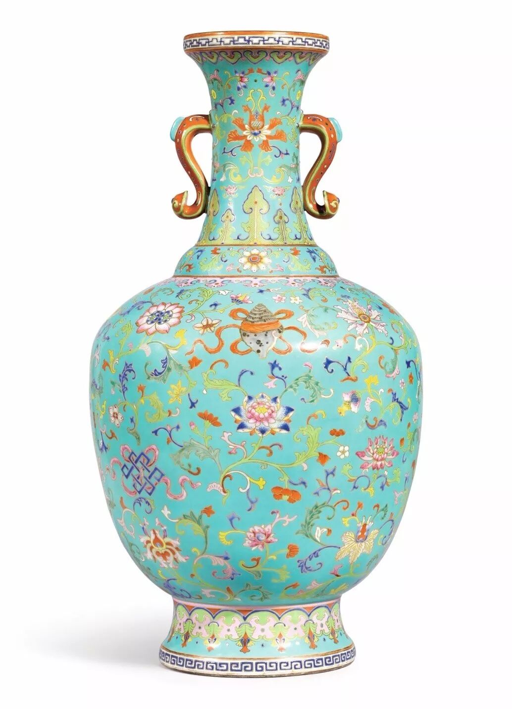 清乾隆松绿地粉彩描金折枝莲八吉祥如意耳瓶
