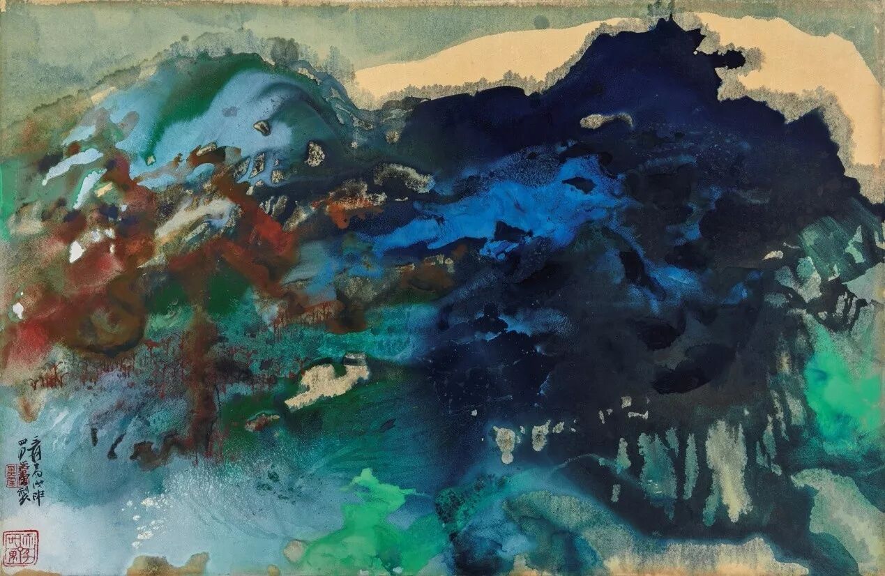 本幅写于一九六八年,大千先生写于巴西八德园,亦即其泼墨泼彩创作大盛之期。画中纯以抽象法写之,仅在左方缀以高低不一的小树丛,才略见笔触,全图被不同颜色铺天盖地所溢满,色彩丰富,交叠融合,千变万化,如彩带流动,营造出一片鸿蒙混沌的视觉效果,与画家六五至六八年间的泼彩力作具异曲同工之妙,亦可视作西方抽象手法及瑞士游历目遇雪山景色所启发影响下的表现。