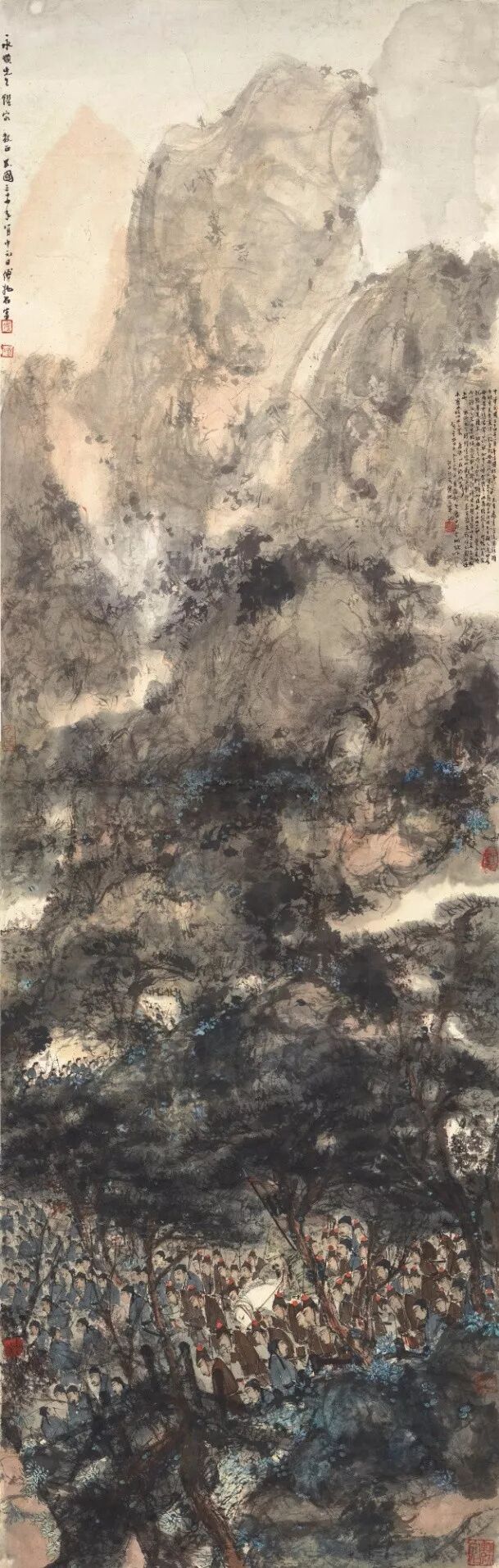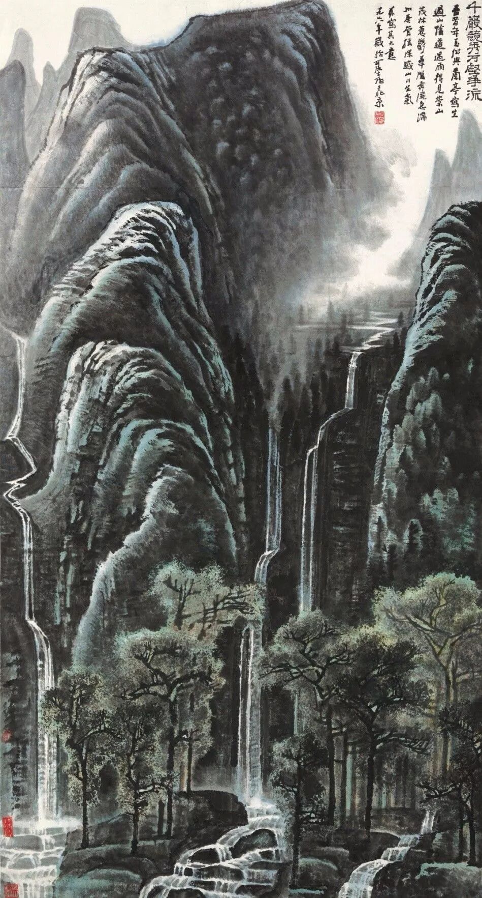 「千岩竞秀万壑争流」句出〈世说新语〉,乃晋顾恺之答客问,称会稽之山川秀美处。一九五六年,李可染有八省写生之旅,在浙江会稽境内,过山阴道中,偶然遇雨,见茂林葱郁,听奔流如管弦,已成心中意象,再读前贤名句,遂有感而发,日后引此为创作题材,遂成「千岩万壑」之图。