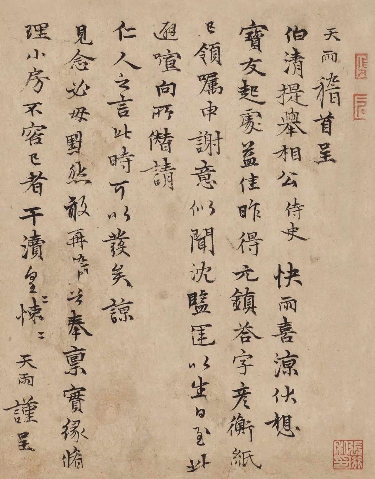 此札书致“伯清提举”,即韩友直,字伯清,号静退老人,又号介石,至元(1335-1340)间任平江财赋副提举。韩伯清与江南文人交谊颇深,元人诗文集中多有与之相关的诗词。倪瓒《清閟阁集》中收录《寄韩伯清》、《寄韩介石》等诗,即为韩伯清与云林交往之见证。而张雨与倪瓒交往甚笃,有寄赠云林诗三十余首。《倪云林先生诗集》亦收云林寄赠张雨之诗三十七首,由此可见一斑。札中“昨得元镇答字”之语,可证三人素有交游。