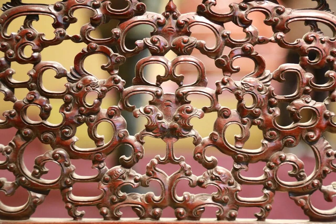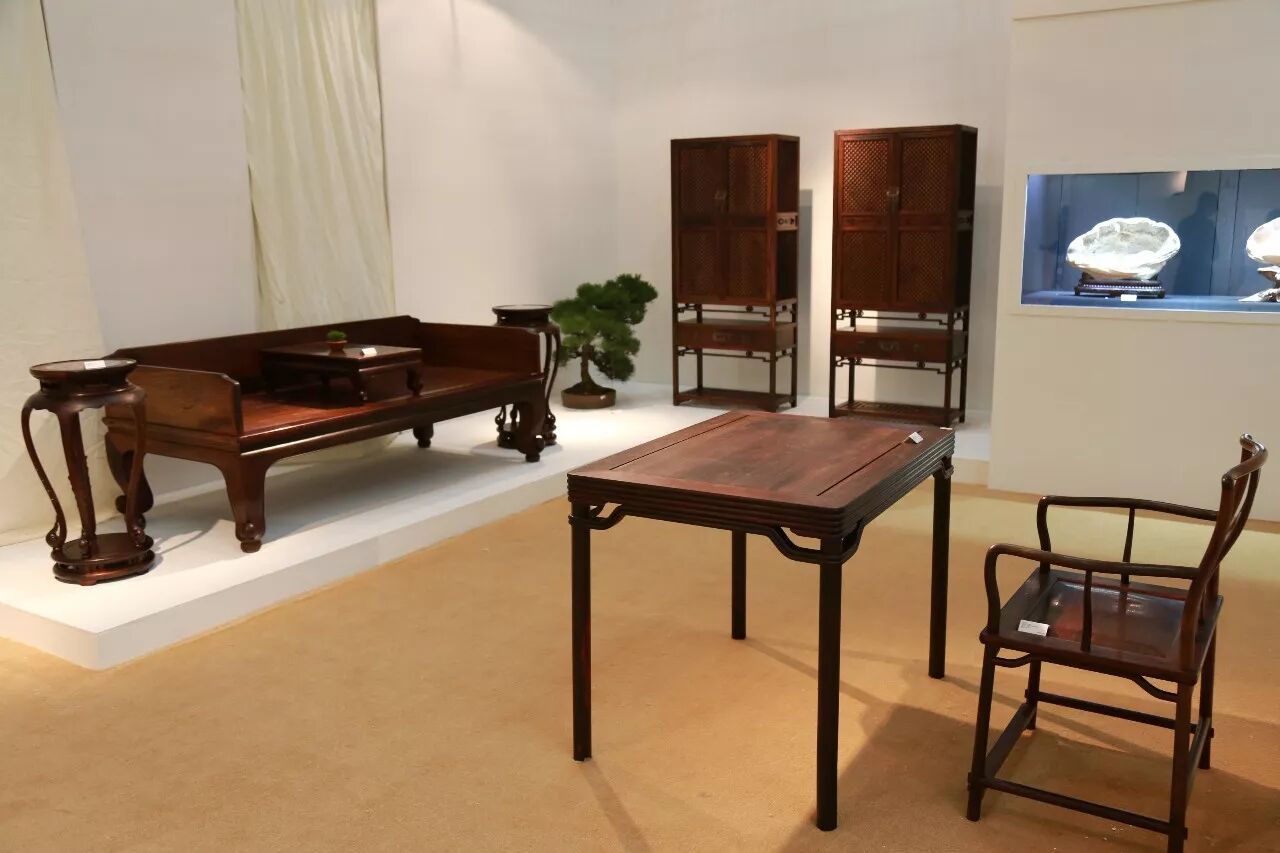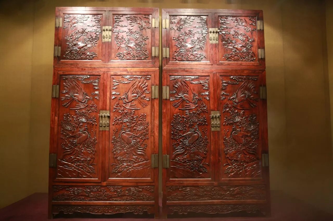 此外,古典家具康熙御制黄花梨大四件柜也让人眼前一亮。黄花梨鸾凤牡丹纹大顶箱柜,为康熙御制宫廷家具中的典型器,最为引人瞩目的是其巨大的尺寸、精湛的雕刻和上好的黄花梨用料。顶箱柜是北方地区常见的一类家具,上有顶箱,下有竖柜,一对合为四件,故又习称大四件柜。柜所用黄花梨选料甚精,门板等处多是一板开出,纹、色基本一致,久在北方,色如蒸栗,质如琥珀,温润可人。