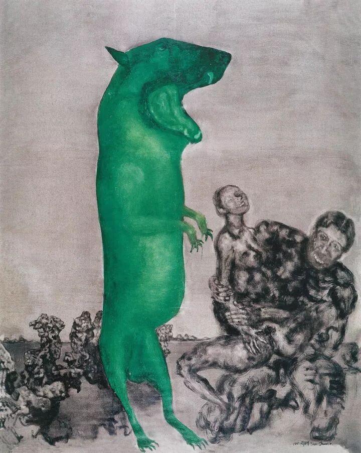 创作于1997年的《月下情人》是周春芽“绿狗”系列的首批作品之一,20年来首现拍场。画面中央的绿色大狗身体朝向画面右侧,模仿着人的体态用两条后腿直立起来,前腿缩在胸前,张开大嘴,展示着一口锋利的尖牙,并伸出了尖锐的爪子。它的耳朵直直竖起,敏锐地捕捉周围的风吹草动,眼睛注视着前方,带着德国牧羊犬与生俱来的锐利和机警。顶天立地的绿狗被置于画面正中,远处的地平线被压的很低,两侧灰色的人体显得渺小、黯淡。绿狗身后是一片湖水,水中立着几块造型各异、纹理复杂的太湖石;身前则是两个以怪异的形态纠缠在一起的人体。