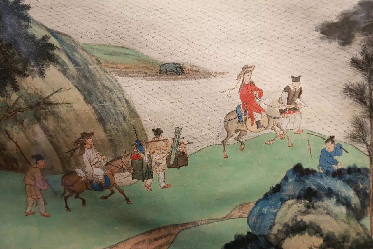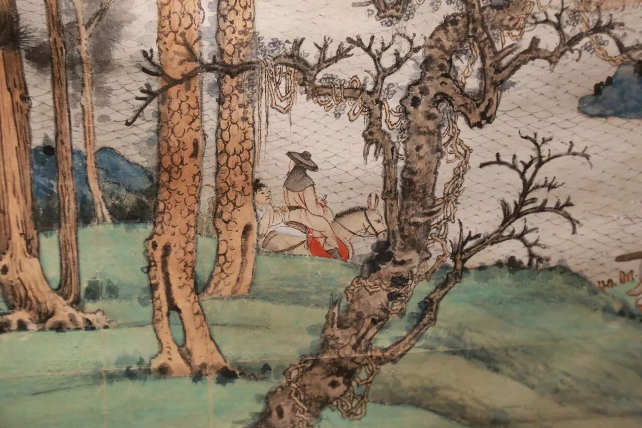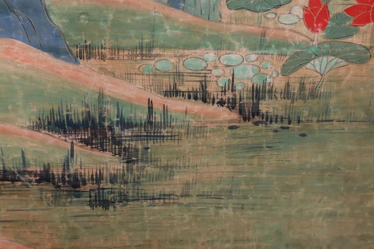▌就在大千购得这幅董源的同年春月,大千在昆明湖上即依原大临摹一幅《江堤晚景》(1946年本),自题“南唐北苑副使董源江堤晚景大风堂临本”。并长题诉及与这幅董源的前后渊源,题跋中不无欣喜自得:“今世欲论南宗,荆关不可复见,遑论辋川。惟此董源为希世宝!”虽曰临本,然整幅青绿设色,鲜丽润泽,皴法、水法、树法、人物、鞍马皆从董源化出而又自出机杼,雍容博大,雄浑壮阔。画中绿波粼粼青山高,酒帘静处马蹄轻,一片春风骀荡。这是大千对董源深切体悟后的倾心力作。