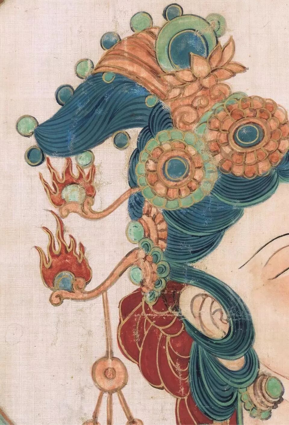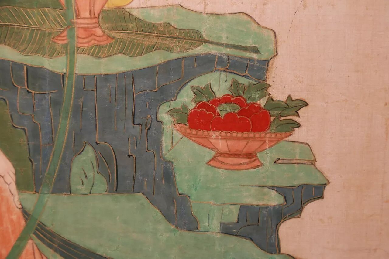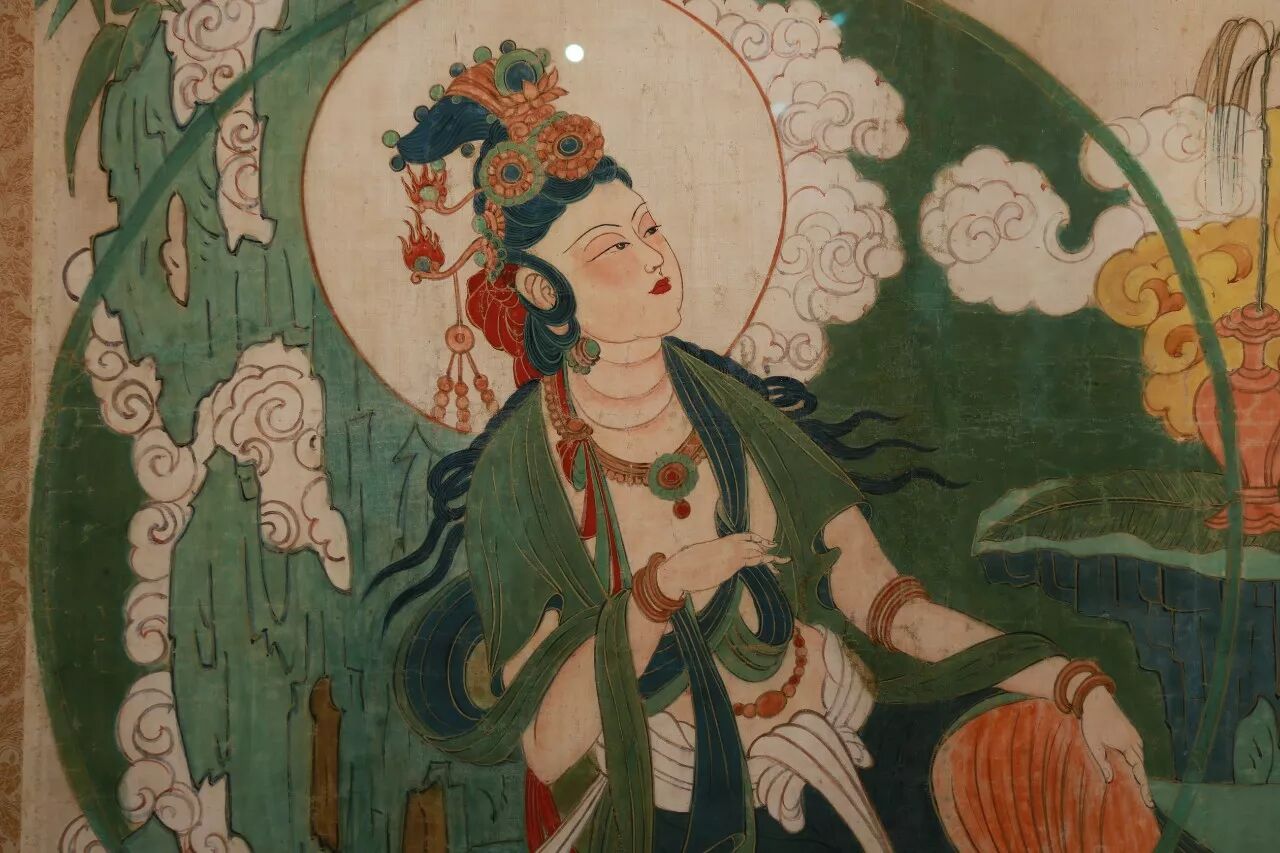 ▌这幅画展示出了更多的张大千个人风貌,主要在于观音造型就如其笔下的仕女人物形象一般娇美妍丽、庄严平和。在绚烂夺目的宗教艺术中表现朴素庄严的文人气质,这是张大千的一大成就。