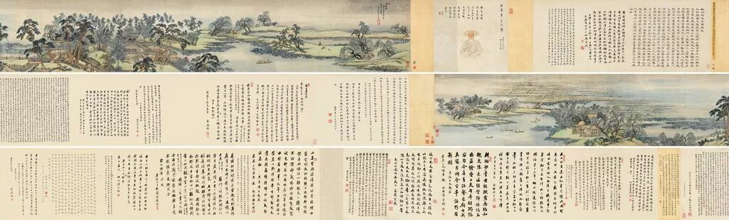 ▌《田居图》卷画得十分用心,王翚将龚氏庄园置于画卷中央,龚氏藏书楼,学稼堂、放鱼轩、心天游室等皆隐现于苍松翠竹高梧湖石之间,主人或对窗读书,或临水习静,或对客夜谈,或倚杖观荷,携童洒扫。周围烟水接天,茭荷满塘,渔歌唱晚,良田广陌极目无垠,远与云天相连。画面安详宁静,确是文人理想的读书闲居之处。画笔苍拙沉着,每多焦墨勾勒,笔老墨沉,倍见功力。