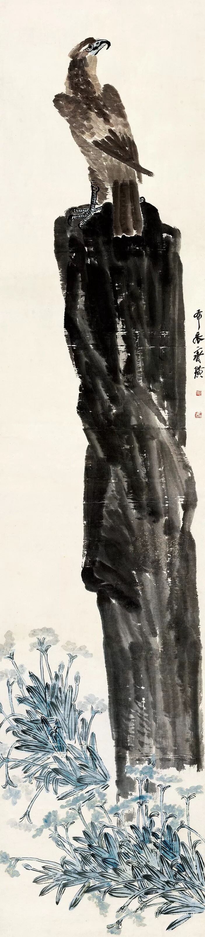 ▌齐白石《英雄独立》高逾三米,为齐白石相赠开国元勋之作,来源显赫。鹰之题材付诸画章,宋代之时尚且作为一种猛禽图像,自蒙元以来构成狩猎文化之符号,蕴含着统治者讲求武备之深意,至明代由于鹰之发音同“英雄”之“英”因此往往象征着充满智慧和勇气的帝国领导者。至民国,画家绘鹰亦多取振奋民族精神之意,以表征其强国意志。