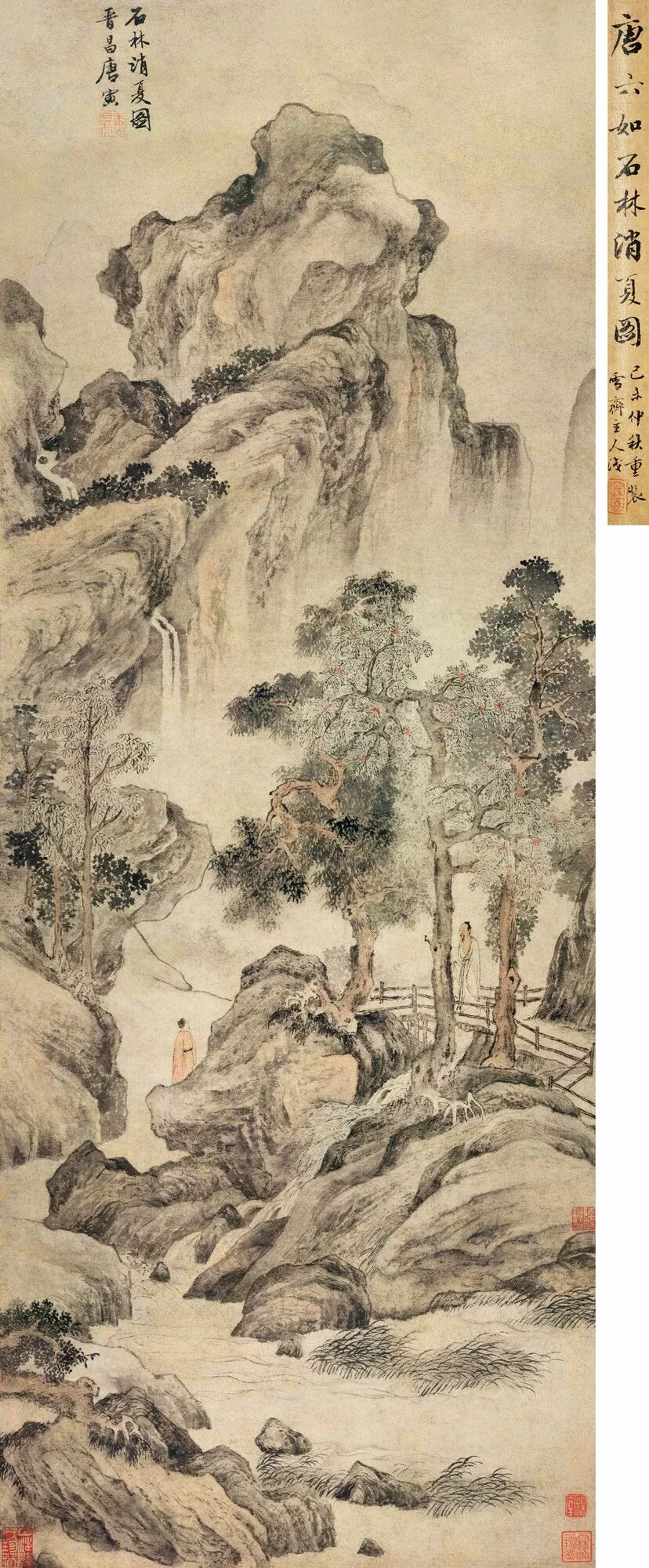 ▌此图写石林消夏,画的似是吴门天平山景色。近处平岗乱石,泉流淙淙流向山外,茂林板桥之上,有高士扶杖入山,不远处一红衣士人正回首相呼。岗后悬崖斜出,危峰入云,泉流奔泻。境界高旷幽绝,画法秀润,虚实生发。石法用小斧劈细皴密擦,间用长线轻松勾勒,尚有周臣遗规。而石上高耸的乔木,则与文徵明画法相近。唐伯虎年轻时与文徵明极友善,又极佩服其人品学问,尝一度愿意委屈身份拜文徵明为师,故早年吸收文徵明画法自在常理之中。画上落款未记岁月,从画法论,似是其较早时期的作品。