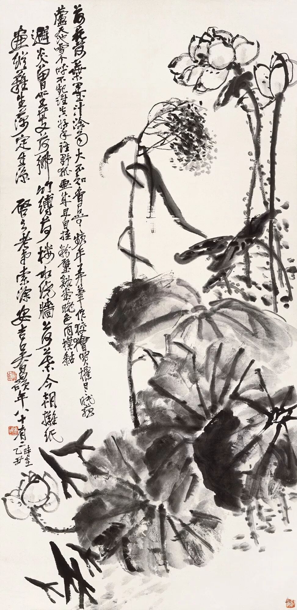 ▌作者创作《墨荷》前对全局把握成竹在胸。右下角大笔泼墨绘层层荷叶,数茎荷花挺立直达画面天庭。左侧自画面顶端直书而下四行题诗,与之平衡。荷花、芦花俯仰顾盼,芦花以悬笔中锋点出。与左下角仰画一荷呼应,构图饱满而空灵,均衡中富于变化。全图纯以篆籀笔法为之,苍劲浑厚。荷花、芦花又以狂草笔意,气势豪纵,恣意挥洒,水墨淋漓。款识中锋行草,一气呵成,相互映照,使全画如书如画,相得益彰。加以三方朱印,醒目提神,乃为金石派集诗、书、画、印一体之典范作品。