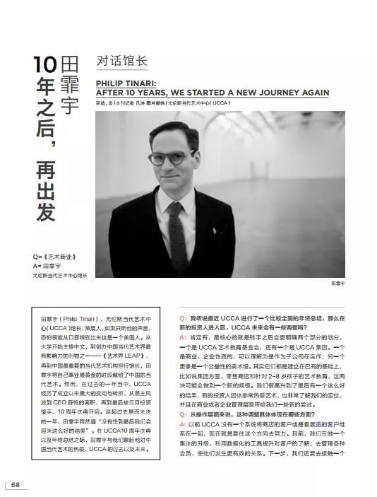 田霏宇(Philip Tinari),尤伦斯当代艺术中心(UCCA)馆长、策展人,如果只听他的声音,恐怕很难从口音辨别出来这是一个美国人。从大学开始主修中文,到创办中国当代艺术界最有影响力的刊物之一—《艺术界 LEAP》,再到中国最重要的当代艺术机构担任馆长,田霏宇将自己事业最黄金的时段献给了中国的当代艺术。然而,在过去的一年当中,UCCA经历了成立以来最大的变动与转折,从易主风波到 CEO 薛梅的离职,再到最后被云月投资接手、10 周年庆典开启。谈起过去悬而未决的一年,田霏宇释然道“没有想到最后我们会迎来这么好的结果”。在 UCCA10 周年庆典以及年终总结之际,田霏宇与我们聊起他对中国当代艺术的热爱、UCCA 的过去以及未来。