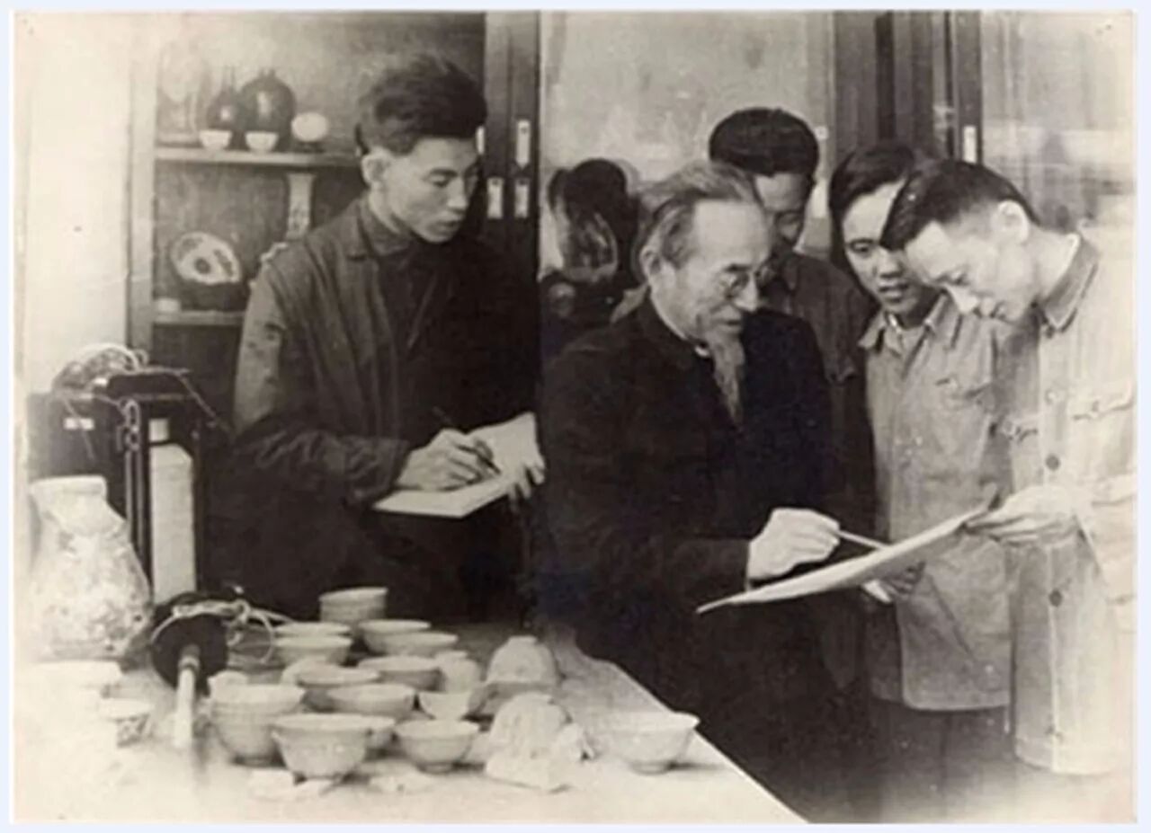 1956年中国科学院上海硅酸盐研究所周仁所长在国瓷组(左起:杨文宪、周仁、李国桢、郭演仪、李家治)