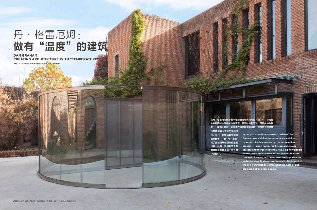 在丹·格雷厄姆由那些半透明反光玻璃做成的“馆”中,你观看他者的同时也是在被他者观看,随着时光的流动,周围的种种景象—绿茵、红砖、云朵也在镜面中逐渐流散,这样的过程同样也是建筑与人发生关系的过程。在丹·格雷厄姆多年来的创作中,“看”与“被看”成了最能理解他创作的重要线索,的确,我们对于自我的建构大多数来自于他人的“审视”。