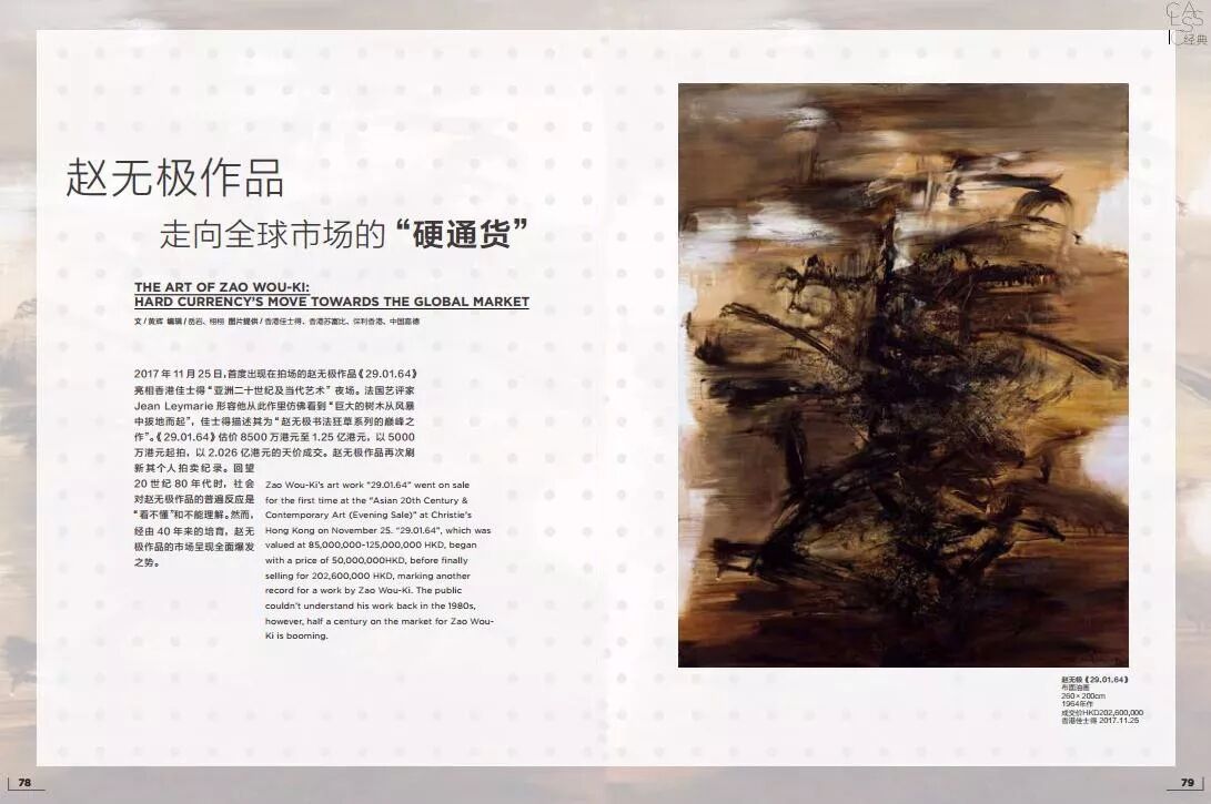 2017年11月25日,首度出现在拍场的赵无极作品《29.01.64》亮相香港佳士得“亚洲二十世纪及当代艺术”夜场。法国艺评家Jean Leymarie 形容他从此作里仿佛看到“巨大的树木从风暴中拔地而起”,佳士得描述其为“赵无极书法狂草系列的巅峰之作”。《29.01.64》估价8500万港元至1.25亿港元,以5000万港元起拍,以2.026亿港元的天价成交。赵无极作品再次刷新其个人拍卖纪录。回望20世纪80年代时,社会对赵无极作品的普遍反应是“看不懂”和不能理解。然而,经由40年来的培育,赵无极作品的市场呈现全面爆发之势。