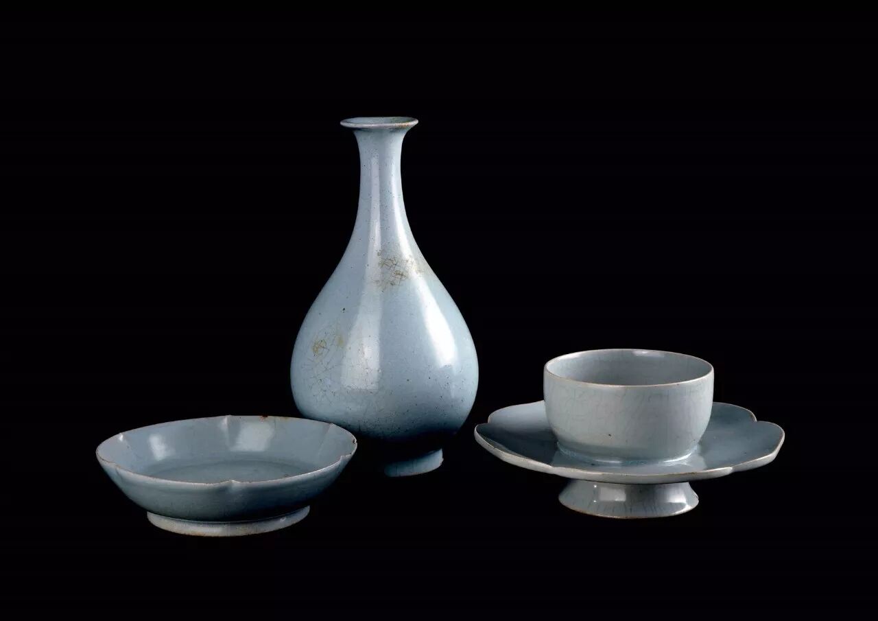 (从左至右)大英博物馆藏的北宋汝窑天青釉花式洗(阿尔弗雷德·克拉克夫妇捐赠)、汝窑天青釉玉壶春瓶(R. A. A. 霍尔特捐赠)、汝窑天青釉盏托(哈里·加纳爵士夫妇捐赠)