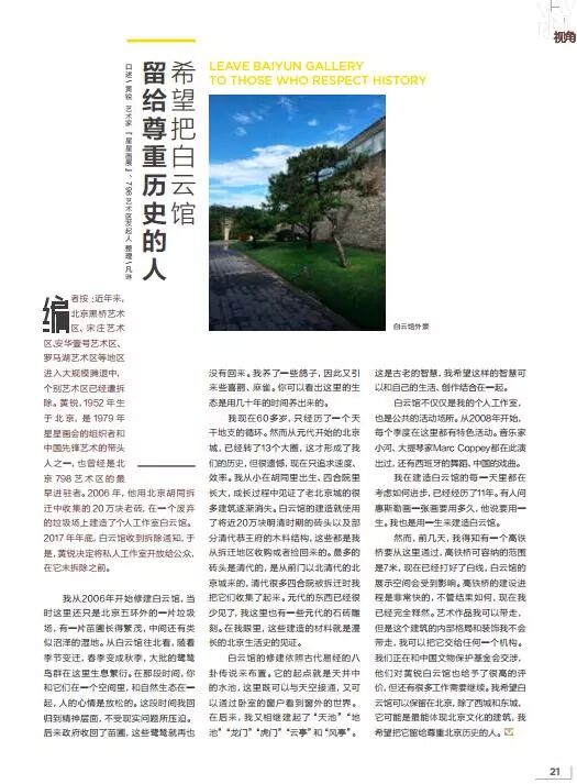 北京黑桥艺术区、宋庄艺术区、安华壹号艺术区、罗马湖艺术区等地区进入大规模腾退中,个别艺术区已经遭拆除。黄锐,1952年生于北京,是1979年星星画会的组织者和中国先锋艺术的带头人之一,也曾经是北京798艺术区的最早进驻者。2006年,他用北京胡同拆迁中收集的20万块老砖,在一个废弃的垃圾场上建造了个人工作室白云馆。2017年年底,白云馆收到拆除通知,于是,黄锐决定将私人工作室开放给公众,在它未拆除之前。