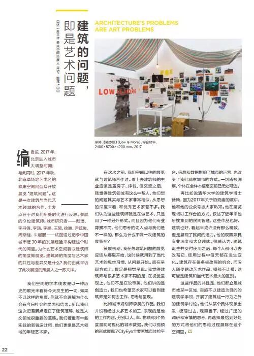 北京进入城市大调整时期;与此同时,2017 年秋,北京草场地艺术区的泰康空间向公众开放展览“建筑问题”。这是一次建筑与当代艺术领域的合作,出发点在于对我们所处时代进行反思。参展的 9 位建筑师、城市研究者—戴璞、李丹锋、李涵、李昊、王硕、徐腾、尹毓俊、周渐佳、朱起鹏—试图通过记录中国城市近30年的发展经验来构建这个时代的问题。为什么艺术空间要以建筑师的角度做展览,建筑师的角度与艺术家的共性与差异又是什么?我们由此采访了此次展览的策展人之一苏文祥。
