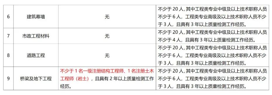 ⑴技术负责人、质量负责人具有8年以上质量检测工作经历及工程类专业正高级技术职称。⑵一级注册结构工程师不少于3名,注册土木工程师(岩土)不少于2名,且具有2年以上质量检测工作经历。⑶质量检测人员不少于100人,其中工程类专业中级及以上技术职称人员不少于40人,工程类专业高级及以上技术职称人员不少于20人,且具有3年以上质量检测工作经历。⑴技术负责人、质量负责人具有5年以上质量检测工作经历及工程类专业高级及以上技术职称。⑵主要技术人员数量不少于“主要技术人员配备表”规定的人数。编者注:4个专项资质需要一级注册人员。由原来的二级改为一级注册人员。