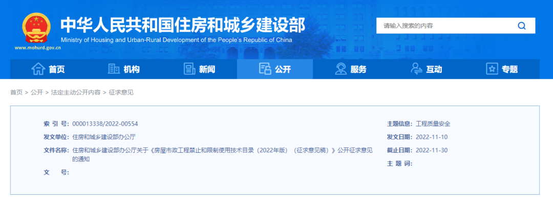 《湖南省居民自建房安全管理若干规定》于2022 年11月23日经湖南省第十三届人民代表大会常务委员会第三十四次会议通过,现予公布,自2023年1月1日起施行。2022年11月15日,住建部发布《房屋市政工程禁止和限制使用技术目录(2022年版)(征求意见稿)》,简易吊机、钢筋“热弯”加工工艺、三点式安全带等多项施工工艺、设备和材料拟被禁止使用。住房和城乡建设部办公厅关于《房屋市政工程禁止和限制使用技术目录(2022年版)(征求意见稿)》公开征求意见的通知为提升建筑工程品质,降低施工安全风险,促进建筑业绿色发展,我部组织起草了《房屋市政工程禁止和限制使用技术目录(2022年版)(征求意见稿)》(见附件),拟禁止和限制一批落后的施工工艺、设备和材料。现向社会公开征求意见,有关单位或个人可于2022年11月30日前通过以下途径和方式提出反馈意见:1.电子邮箱:gcjsc@mohurd.gov.cn(请提供签字盖章扫描件和同版本可编辑文档)2.通信地址:北京市海淀区三里河路9号住房和城乡建设部工程质量安全监管司 (邮编:100835)附件:房屋市政工程禁止和限制使用技术目录(2022年版)(征求意见稿)