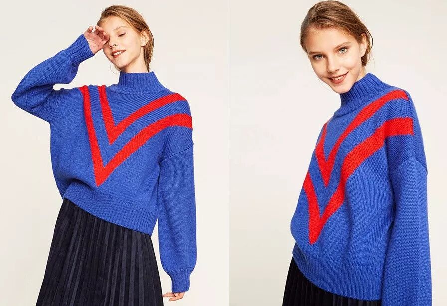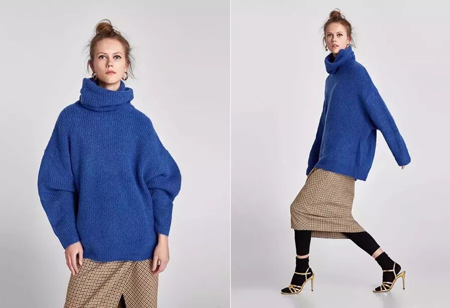 说了这么多小技巧,姐也找了几件挺喜欢的毛衣,来来来,接着。zara宝蓝色宽松高领毛衣,参考价:299元,记得露出脖子▼