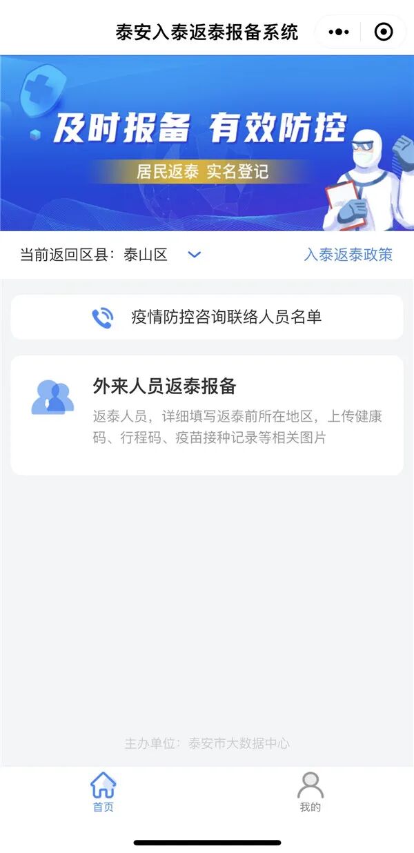 记者从泰安市大数据中心了解到,为进一步做好入泰返泰人员提前报备、后续管控工作,实现可视化、信息化、全流程管理,解决传统人工手段登记慢、通行效率低等问题,泰安市大数据中心充分发挥数字化和大数据的优势,组织开发了“泰安入泰返泰报备”小程序,并于7月15日起在全市推广应用,这将为疫情防控政策落实、快速复工复产、便利群众生活提供重要支撑。
