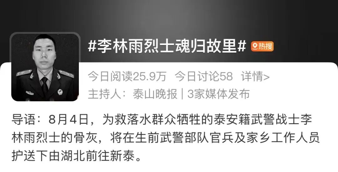 李林雨,2000年5月出生,2021年12月入伍(定向培养警士),武警下士警衔,生前系武警湖北省总队随州支队某部战士。7月12日下午,正在巡逻途中的李林雨和战友涂鑫,紧急救援掉进水库中的群众,李林雨下水托举,涂鑫在岸上拖拽,合力将落水群众救到了岸上安全处。李林雨因体力透支,不幸沉入水中,壮烈牺牲。8月1日,武警湖北总队在武汉举行“李林雨烈士追授平时一等功暨英雄事迹学习动员大会”,给李林雨同志追授平时一等功、向李林雨的父母颁授李林雨的烈士证书、证章,并决定在总队开展向李林雨烈士学习的活动。![]()