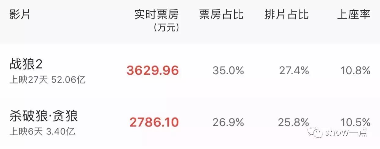截至我们推送前,《战狼2》的票房达到了52亿。上映27天,排片和上座率还比上映6天的《杀破狼·贪狼》要多▼▼▼