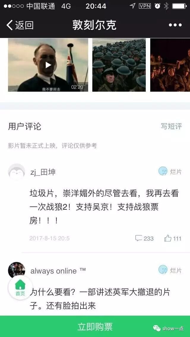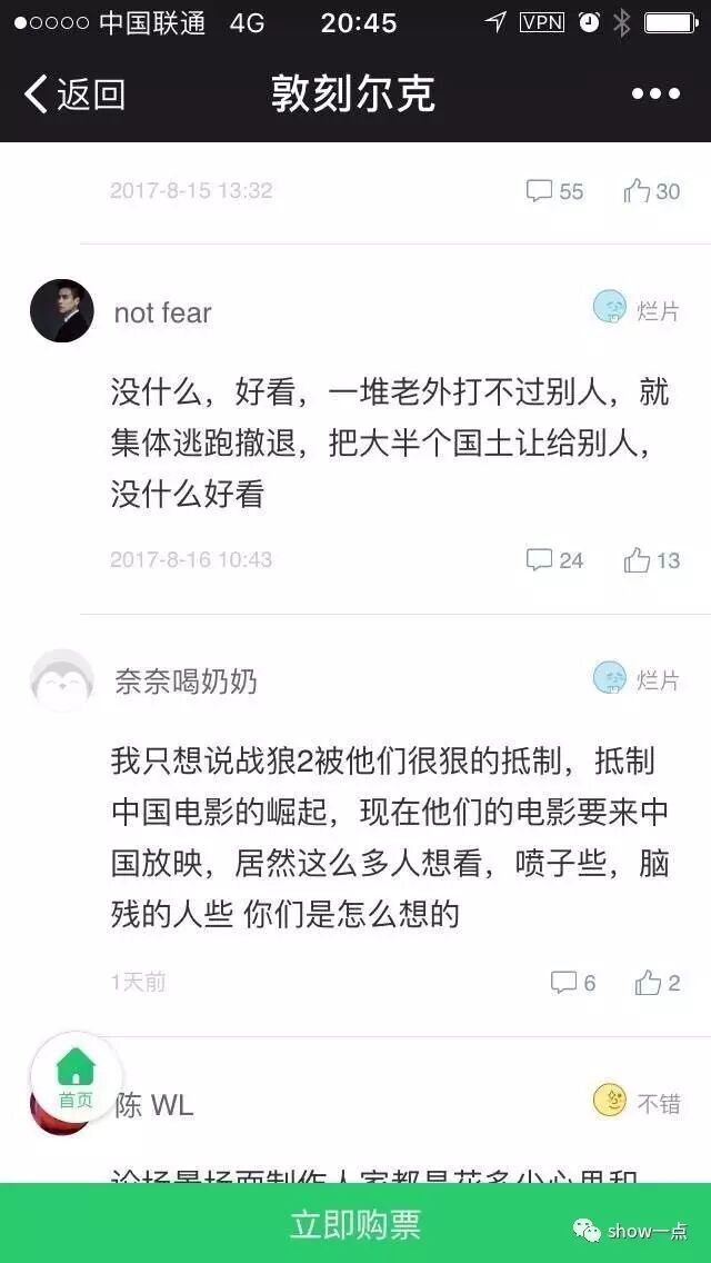 部分吴京粉丝就跟疯了一样,和诺兰粉给《教父》刷一星差不多,他们也集体去了《敦刻尔克》的购票页面给负评。