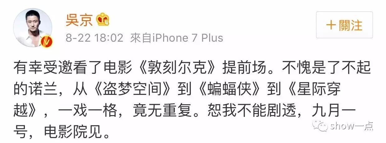 同时,在今天傍晚,吴京还在微博上为《敦刻尔克》打了个电话▼▼▼