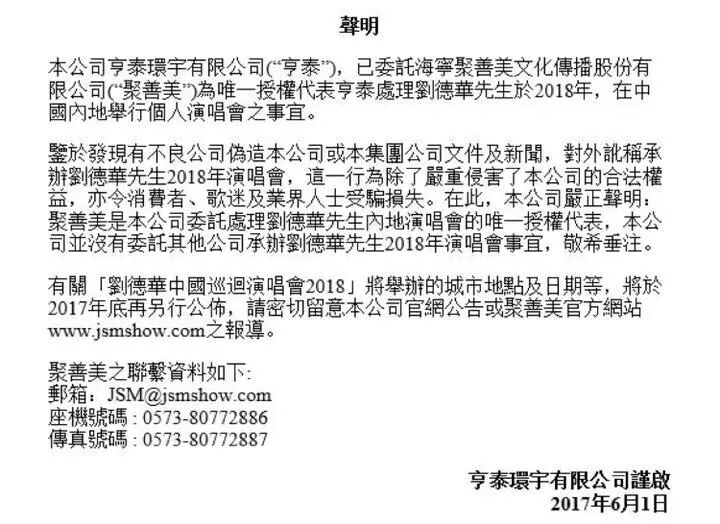2017年6月1日,因为内地部分不法商人对外讹称已承办刘德华2018年演唱会,为了避免公众被骗,刘德华的映艺集团旗下的亨泰环宇有限公司发出声明,称: