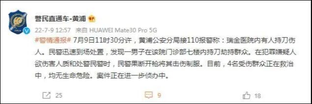 瑞金医院内有人持刀伤人。民警迅速到场处置,发现一男子在该院门诊部七楼内持刀劫持群众。在犯罪嫌疑人欲伤害人质和处警民警时,民警果断开枪将其击伤制服。目前,4名受伤群众正在救治中,均无生命危险。案件正在进一步侦办中。