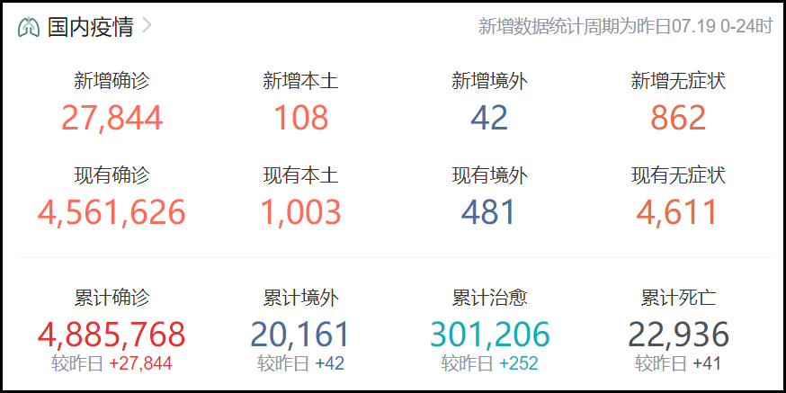 截至7月19日24时,据31个省(自治区、直辖市)和新疆生产建设兵团报告,现有确诊病例1484例(其中重症病例1例),累计治愈出院病例221270例,累计死亡病例5226例,累计报告确诊病例227980例,无现有疑似病例。累计追踪到密切接触者4481672人,尚在医学观察的密切接触者103176人。