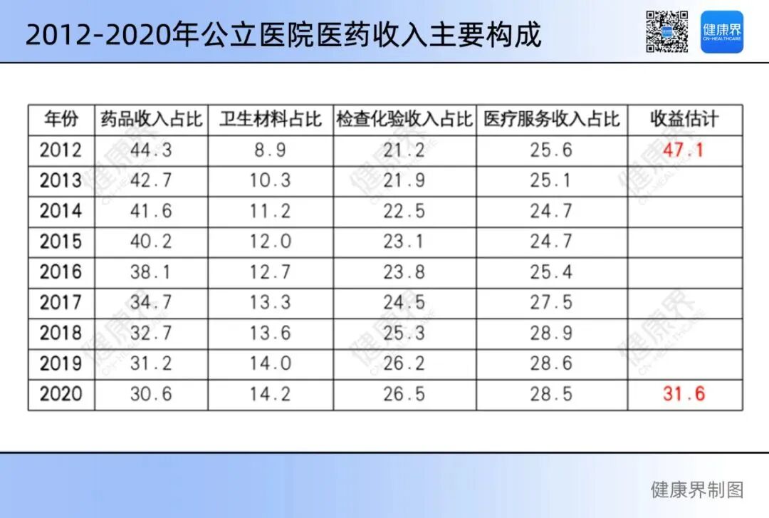 这一说法是有一定数据支撑的。国家卫健委一位卫生政策研究者在2022健康界云峰会上介绍,2012年,公立医院药品收入占总收入的44.3%,医疗服务性收入占比25.6%。
