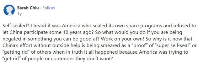 首先,中国的大部分太空计划都由中国工程师和科学家负责。你认为中国人该选择说什么语言?还是你认为中国太落后了,只能靠外援来实现太空计划呢?他们可能是高科技的后来者,但他们在过去30年中取得了长足进步。中国人没有依赖外援来发射航天器,也没有依赖外援来设计和制造你正在使用的5G智能手机。说普通话的人比说其他任何语言的都多。你凭什么认定他们要在自己的太空项目中使用“国际”语言?这听起来多么傲慢。